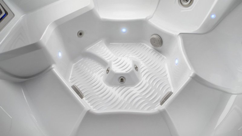 The open-seat design seats up to seven people in a 213 × 213 cm footprint. The footwell houses four precision directional jets for a foot massage in nearly every seat.